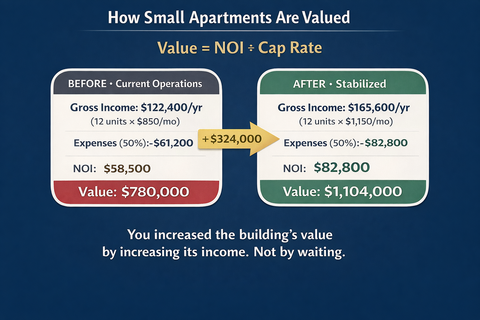 That is $324,000 in forced appreciation, created entirely by improving the building's operations. Not by waiting for the market to move.
